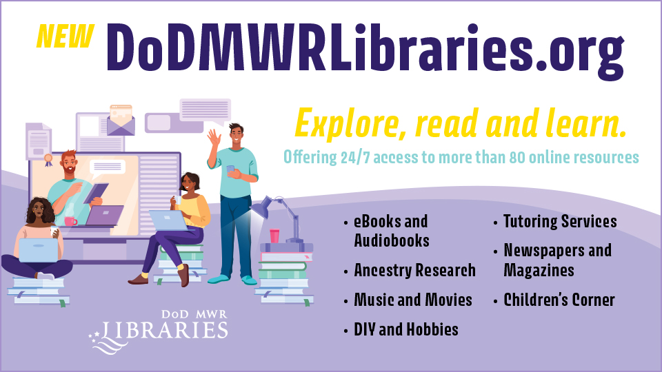 Along with having access to your brick and mortar MWR library branch, authorized users have access to the Department of Defense Digital Library (DODMWRLibraries.org). This resource provides access to digital e-books, downloadable audiobooks, digital magazines, educational databases, small business resources, and so much more. For more information, please visit the website or speak to your library staff today!